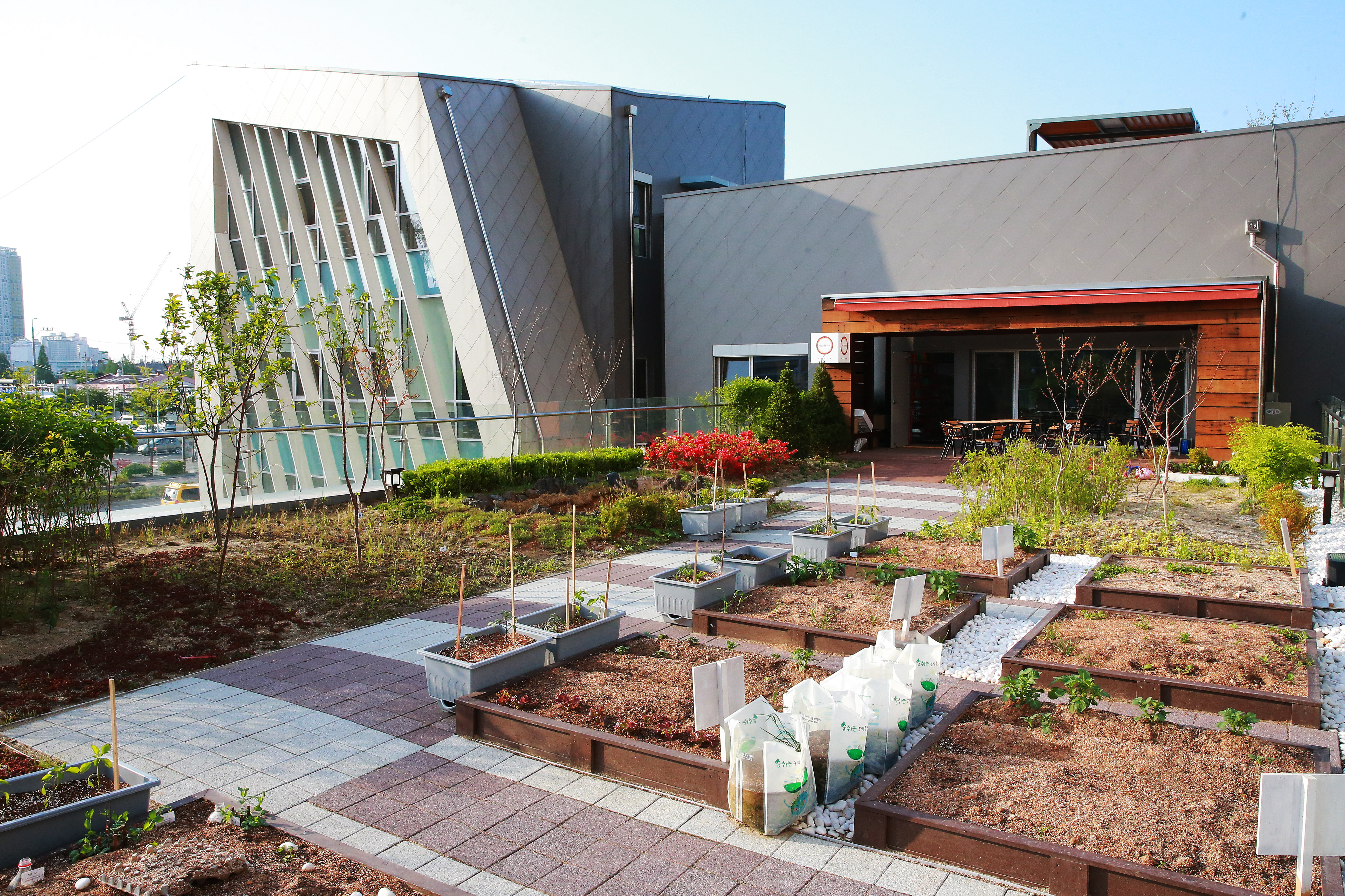 또 지붕에는 태양광 발전시설과 옥상정원, 옥상텃밭을 만들어 태양열 열섬 효과를 줄였다.
