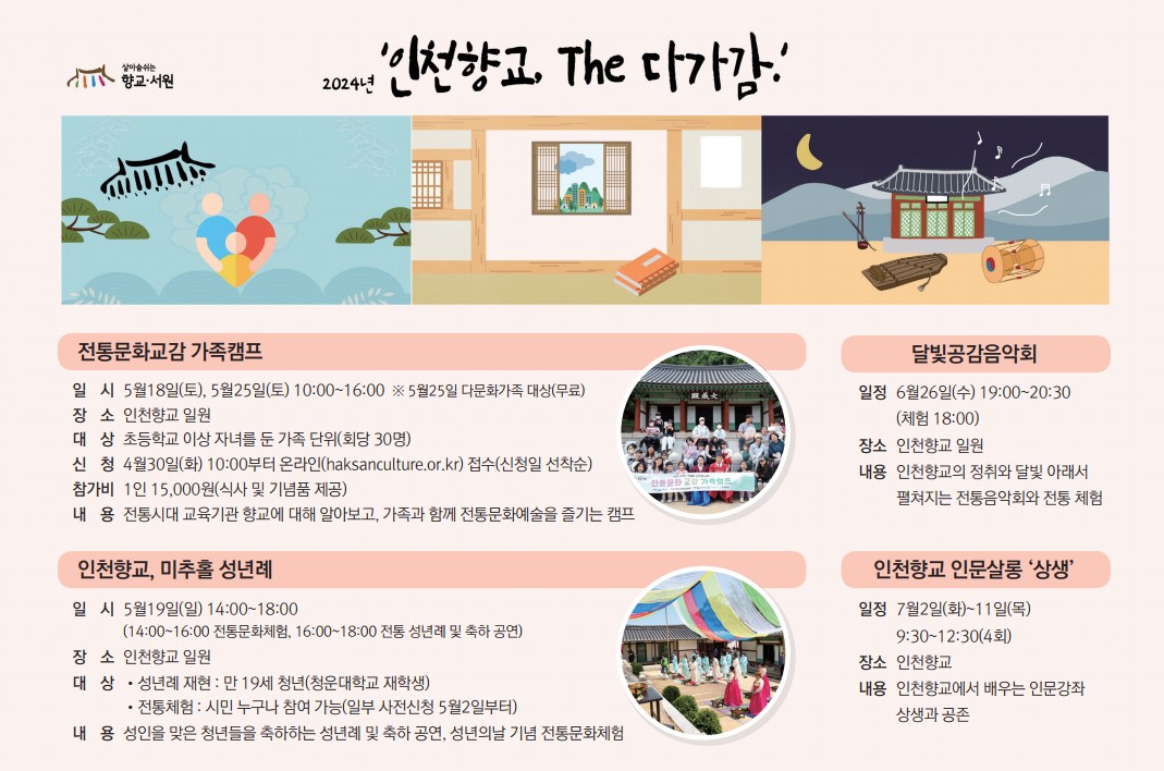 5월 이후에도 6월26일(수) 저녁 7시에는 ‘달빛공감음악회’, 7월2일(화)부터 11일(목)까지 총 4회에 걸쳐서는 ‘인천향교 인문살롱 상생’이 진행될 예정이다. 프로그램별 참여 신청은 미추홀학산문화원 누리집에서 할 수 있으며, 자세한 사항은 미추홀학산문화원으로 문의하면 된다. 문의 미추홀학산문화원 ☎ 866-3994