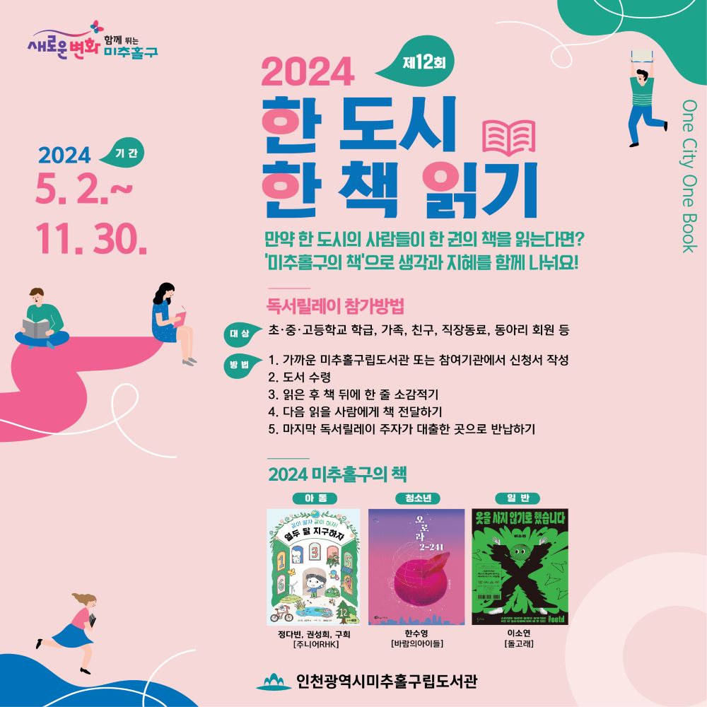 미추홀구는 5월1일 구민의 날에 진행된 ‘2024 한 도시 한 책 읽기’ 책 선포식 행사에서 올해 ‘미추홀구의 책’을 공개하고, 11월까지 독서릴레이를 운영한다. 독서릴레이는 문화도시 미추홀구의 비전을 제시하는 독서 진흥 사업으로, 2013년부터 시작해 올해로 12회를 맞이했다.