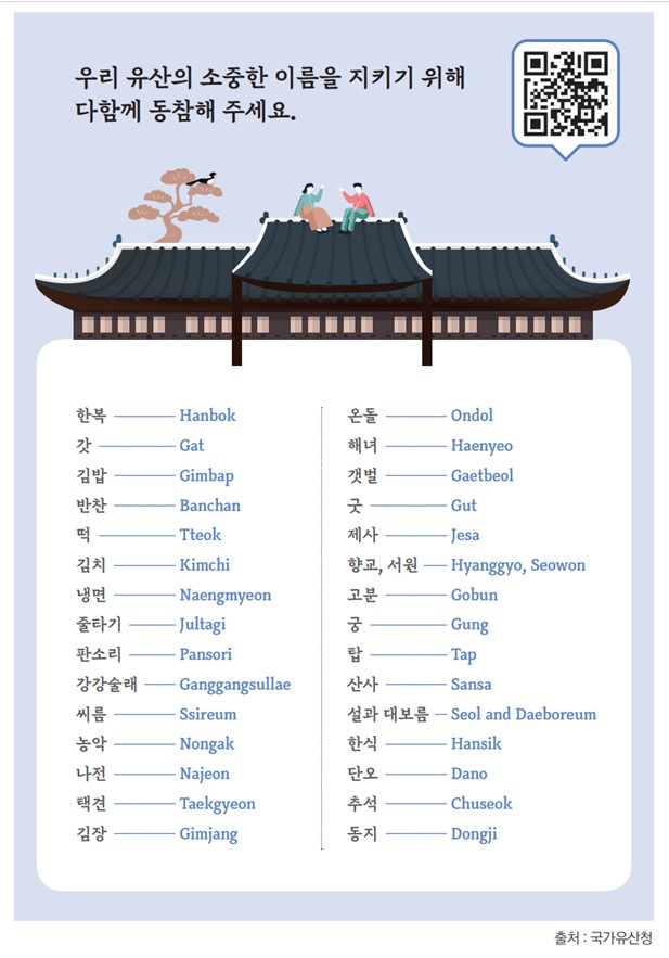 한류가 세계적으로 주목받으며 한국문화를 소개할 기회가 늘어나고 있다. 이에 국가유산청은 국가유산의 고유한 명칭 그대로를 영문으로 사용하는 풍토를 확립하기 위해 ‘우리 유산 이름 그대로 쓰기’ 캠페인을 추진하고 있다.