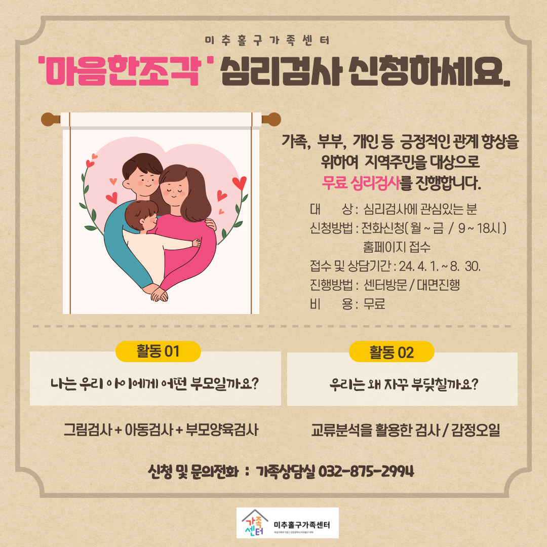 2024년 미추홀구가족센터는 부부, 부모와 자녀, 다문화가족 등 다양한 가족들과 함께하는 심리검사 프로그램 ‘마음한조각’을 준비했다. ‘마음한조각’은 친구에게 이야기하듯이 편한 마음으로 나의 마음 한구석에 있는 작은 마음한조각을 찾아보며 나의 심리적 궁금증을 해소하고자 시작하게 된 사업이다. 미추홀구가족센터 관계자는 “최근 부부 고민, 자녀 고민을 상담하는 방송을 보며 개인, 부부, 부모와 자녀 가족 관련 상담을 받아보고자 하는 마음이 생겼지만, 막상 용기가 없는 분들을 위해 가벼운 마음으로 참여하실 수 있는 내용으로 구성했다”라고 밝혔다. ‘마음한조각’은 ‘나는 우리 아이에게 어떤 부모일까요?’, ‘우리는 왜 자꾸 부딪칠까요?’라는 소주제로 구성돼 진행된다. 부모와 자녀 관계를 탐색할 수 있는 활동인 ‘나는 우리 아이에게 어떤 부모일까요?’에서는 그림 검사, 아동 기질 검사, 부모 양육 태도 검사를 통해 양육에 어려움을 느끼는 부모가 자녀에 대해 알고, 자녀가 어떤 성향인지, 나의 양육 태도와 어떤 연관성이 있는지 알아본다. ‘우리는 왜 자꾸 부딪칠까요?’에서는 나와 관련된 인간관계를 알고 다시 새로운 결정을 할 수 있도록 돕는 검사로 진행되며, 감정 치유 능력이 있는 아로마오일을 사용해 나의 마음을 들여다보고 나와 관련된 관계에서 긍정적인 방향성을 찾을 수 있다. 프로그램은 총 2회기로 심리검사 1회, 해석 상담 1회로 진행되며, 이후 심화 상담을 원하면 무료로 8회기를 진행할 수 있다.