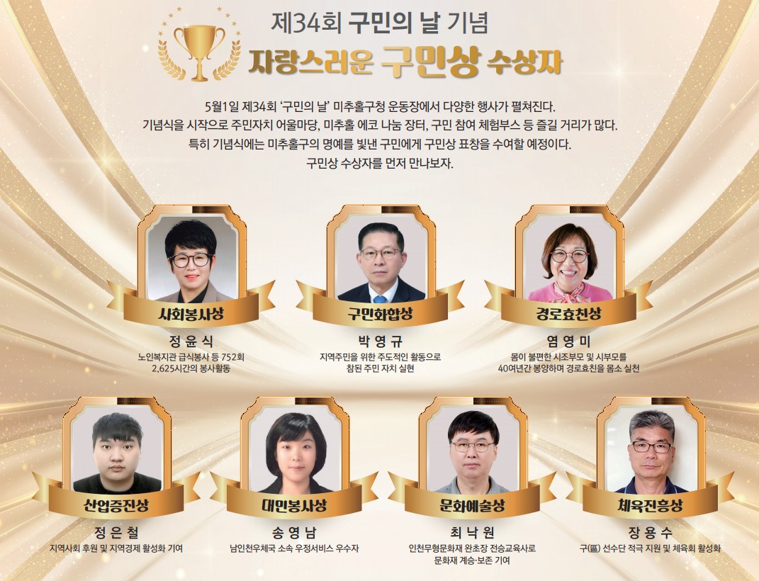 5월1일 제34회 ‘구민의 날’ 미추홀구청 운동장에서 다양한 행사가 펼쳐진다. 기념식을 시작으로 주민자치 어울마당, 미추홀 에코 나눔 장터, 구민 참여 체험부스 등 즐길 거리가 많다. 특히 기념식에는 미추홀구의 명예를 빛낸 구민에게 구민상 표창을 수여할 예정이다.