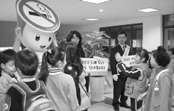 학생들은 친근하고 귀여운 금연홍보용 인형탈을 보며, 손을 흔들고