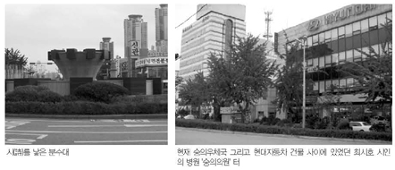숭의로터리 지금의 우체국과 현대자동차 건물이 들어서기 전 ‘숭의의원’이 있던 곳으로 눈뜨면 보아 온 로터리 분수대, 지금도 한없이 물줄기를 뿜어대며 여름날의 더위를 잠재우고 있다.