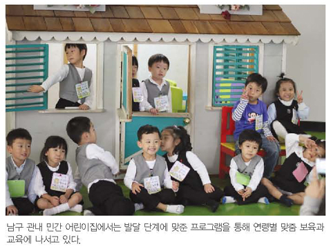 실제로 어린이집의 경우 0~만2세를 대상으로 한 영아반은 보육에, 만3~5세 유아반은 교육에 비중을 두고 발달에 맞춘 프로그램을 진행하고 있다.