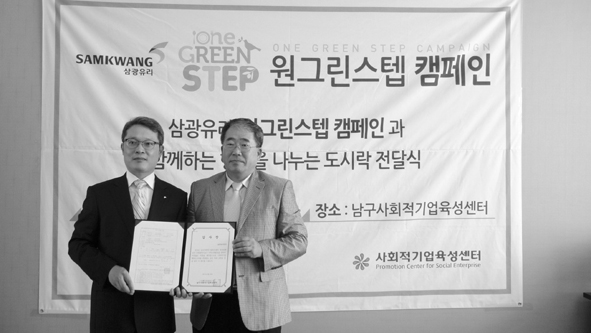 삼광유리는 사회공헌 책임 프로그램과 마케팅을 접목시킨다는 데 큰 관심을 나타냈다. 자연친화적인 사업을 펼치겠다는 의지를 담아 ‘원 그린 스텝 캠페인’이라는 명칭을 만들어냈다. 그리고 이날 유리밀폐 용기 글라스락 도시락 400세트를 주는 전달식을 가진 것이다. 센터에게도 이날 행사는 의미가 특별하다. 사회적기업이 기업으로 재생할 수 있는 다각적인 컨설팅을 시도, 그 첫 결실을 맺었기 때문이다.
