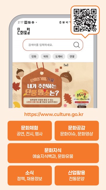 문화생활을 하기 좋은 가을을 맞았지만, 수많은 정보와 자원이 넘쳐나는 바람에 어디서 어떻게 접근해야 할지 쉽지 않다는 이들이 많다. 기관별 흩어진 정보를 일일이 찾아내는 것이 어렵고 귀찮은 일로 느껴져 문화생활을 멀리하게 된다고 말하는 이들도 적지 않다. 그런 이들이 이용하면 딱 좋을 대한민국 공식 전자정부 누리집인 ‘문화포털’(https://www.culture.go.kr/ )을 소개한다. ‘문화포털’은 문화체육관광부와 소속기관, 공공기관에서 생산되는 다양한 한국의 문화예술, 문화유산, 문화산업, 관광, 체육, 도서 정보 등을 제공하는 원스톱 서비스이다. 공공분야 문화 종합정보 제공사이트로 국민들이 더 쉽고 편리하게 이용할 수 있도록 문화체육관광부 소속뿐만 아니라 지자체, 민간의 문화 관련 내용들을 한 곳에서 모아볼 수 있게 했다.‘문화포털’ 누리집에 접속하면 문화체험, 문화공감, 문화지식, 문화알리미 카테고리를 쉽게 찾을 수 있다. 각 카테고리에서는 문화 정보를 공연·전시, 행사·축제, 교육·체험 등 분야별로 볼 수도 있고, 요일별, 월별로 한눈에 확인할 수도 있다. 또한 유료 공연을 무료로 볼 수 있는 티켓 이벤트를 확인하거나 문화와 관련된 뉴스, 영상, 인터뷰 등의 콘텐츠부터 정책이나 사업, 채용 정보까지 만날 수 있다. 특히 코로나19 이후 집에서 즐길 수 있는 온라인 공연들도 많아져 문화포털에서 영상을 찾아 집에서도 쉽게 즐겨볼 수 있어 바쁜 일상 속 틈틈이 문화를 만나볼 수 있다.