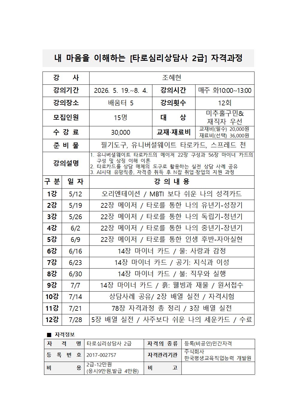 내마음을 이해하는 타로심리상담사 2급 자격과정